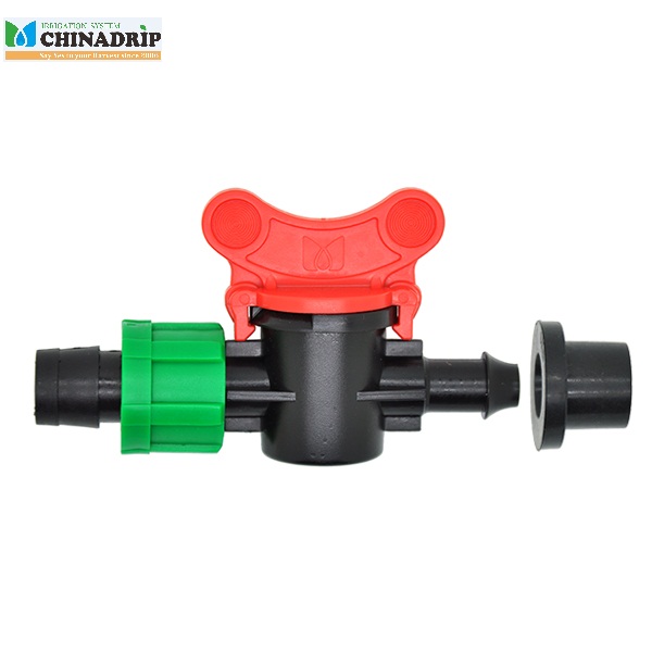 Válvula de bola sencilla, fácil de usar y de bajo valor para cinta de goteo de paredes delgadas. Elaborado con materia prima de alta calidad, protección UV y antienvejecimiento. Buena opción para cinta de goteo.